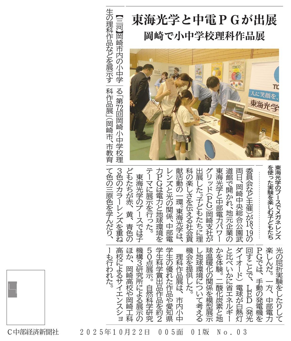 岡崎市内の小中学生による理科作品などを展示する「第72回岡崎小中学校理科作品展」が10月18日・19日に岡崎中央総合公園で開催され、子どもたちに理科の楽しさを伝える社会貢献活動の一環として、東海光学が出展いたしました。東海光学のブースでは、カラーレンズを重ねて色の三原色を学んだり、光の屈折実験を体験していただきました。 |