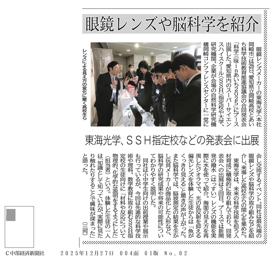 東海光学は、自然科学研究機構岡崎コンファレンスセンターにて開催された、愛知県立岡崎高校とあいち科学技術教育推進協議会の合同発表会「科学三昧inあいち2025」にブース出展いたしました。最先端の眼鏡レンズや脳科学の取り組みなどを紹介し、来場した高校生の関心を集めました。これからも地域の教育活動に積極的に参加し、若い世代の学びを応援していきます。 |