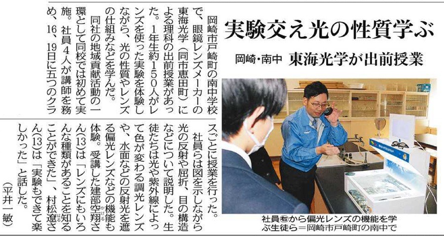 東海光学は岡崎市立南中学校の1年生約150人のみなさんに理科の出前授業をおこないました。様々な種類のレンズを使った実験を体験しながら、光の性質やレンズの仕組みなどを学んでいただきました。 |