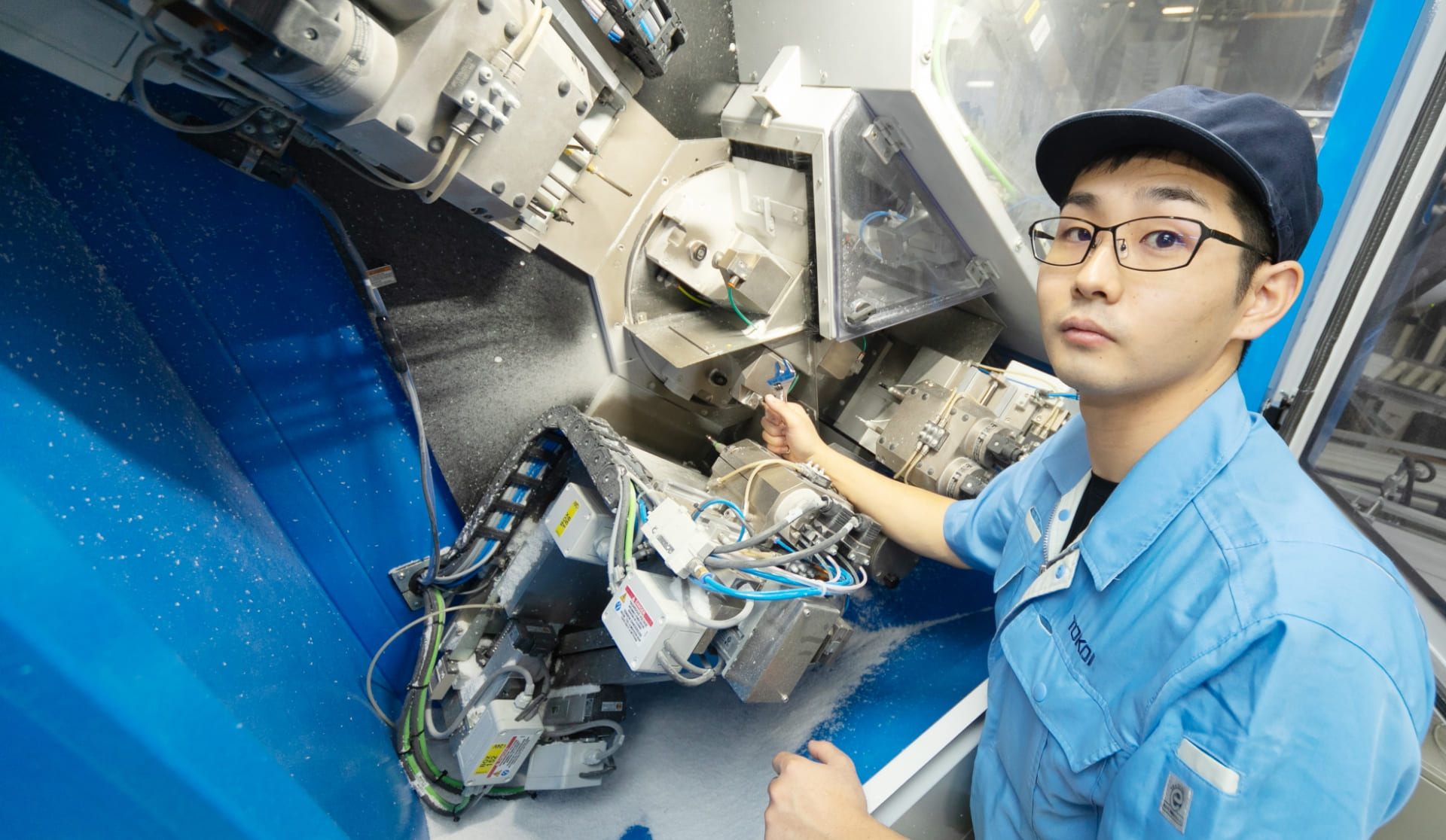 - 主に眼鏡レンズを製造するための装置を維持管理する設備管理の仕事をしています。装置が故障した際の修理や、装置がトラブルを起こす前の定期点検、予防保全などの保守・メンテナンスの保全業務です。他にも装置が安定稼働するための部品変更やプログラム変更などを行い、より品質や生産性を高めて稼働率の良い装置にするための改善活動も行います。自社で装置や治具などを設計・製作したり、新しい装置の導入を行ったりもします。