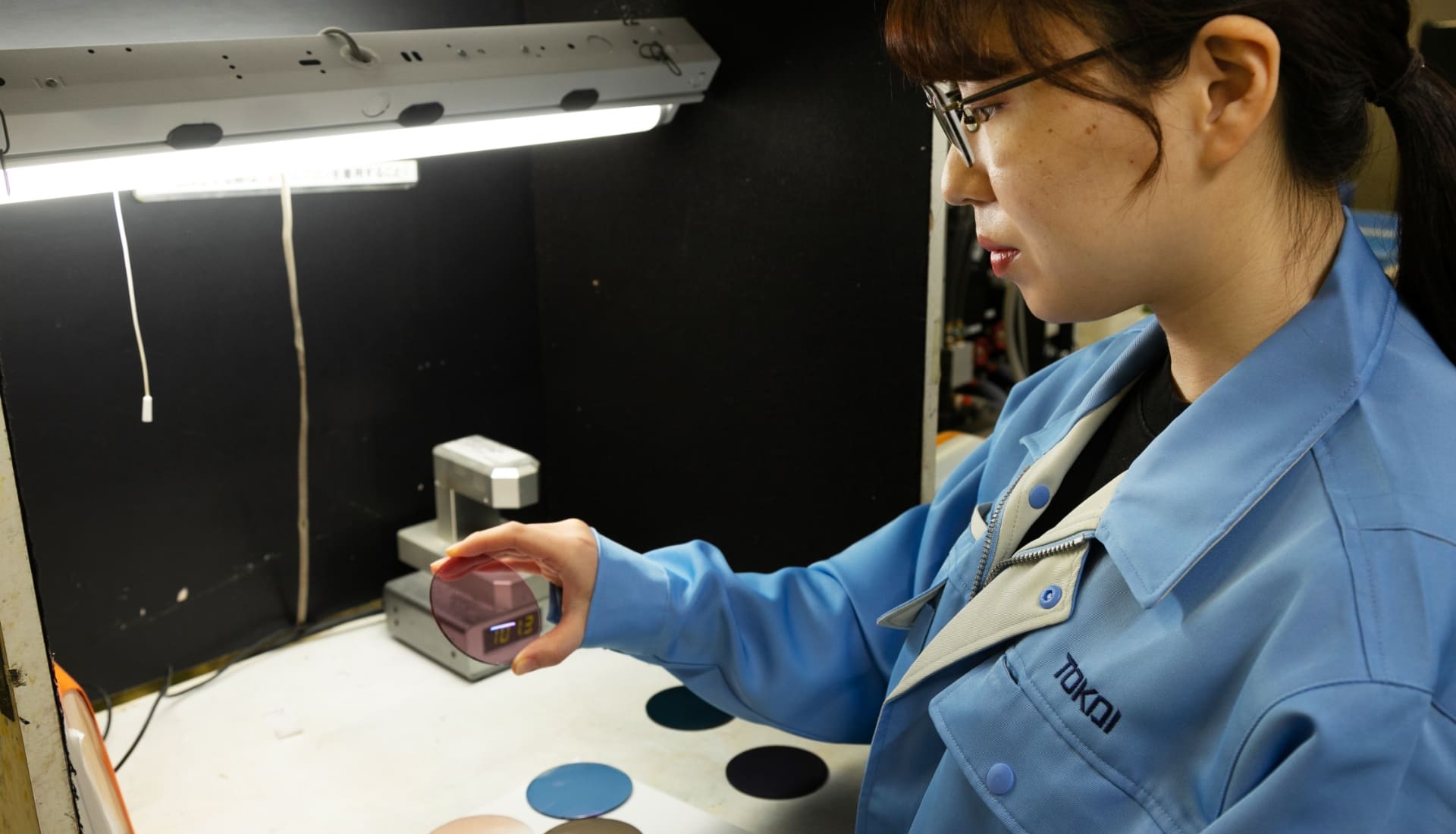 開発本部の染色担当として、カラーレンズの開発に携わっています。お得意様(眼鏡店様)とオリジナルのカラーレンズを開発することもあり、商品化して終わりではなく、生産現場と一緒に良品率や作業効率などの改善も行っています。